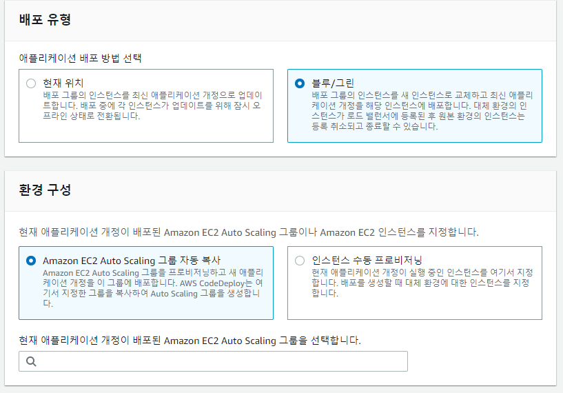 환경 구성은 Amazon EC2 Auto Scaling 그룹 자동 복사를 선택하고 미리 생성해둔 auto scaling 을 선택해준다.