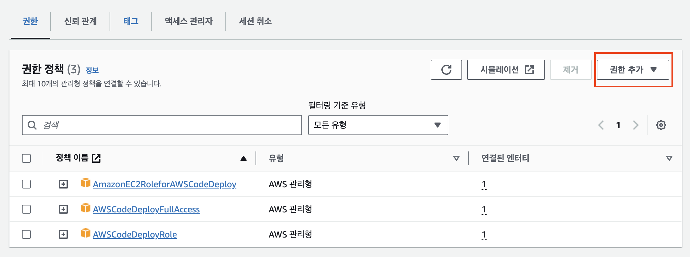 EC2 와 Codedeploy를 사용하기 위해 아래 3가지 권한을 추가해준다.