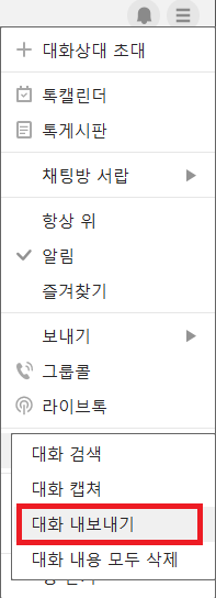 카카오톡 대화창 -> 햄버거메뉴 -> 대화내용 -> 대화내용내보내기