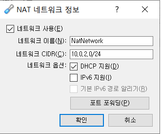 파일 -> 환경설정 -> 네트워크 -> 네트워크 추가 -> 네크워크 CIDR이 ip대역 -> 포트포워딩 -> 호스트 포트 변경해주고(내 컴퓨터에 접속하기위한 포트) -> 게스트 ip는 가상머신에 할당한 ip적어주기
