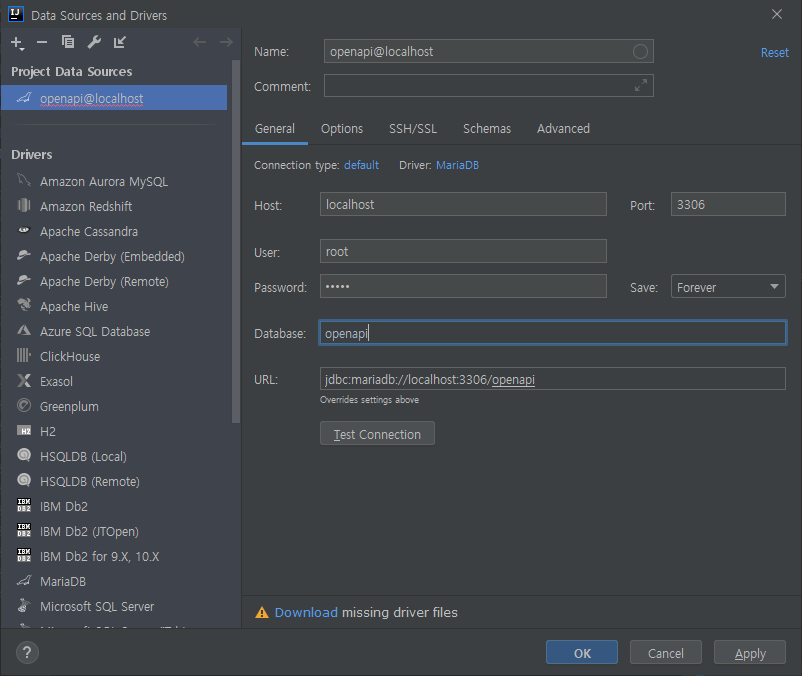 URL하단에 Test Connection 을 눌러 데이터베이스가 올라갈 수 있도록 한다.