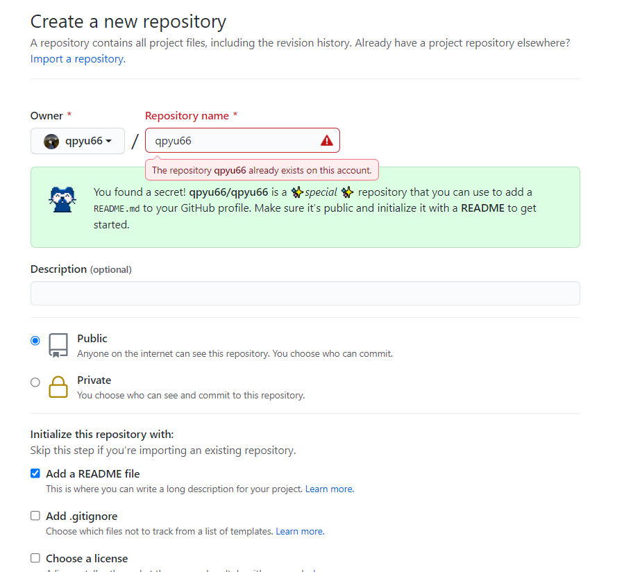 1. 내 이름과 같은 이름으로 repository를 만든다.